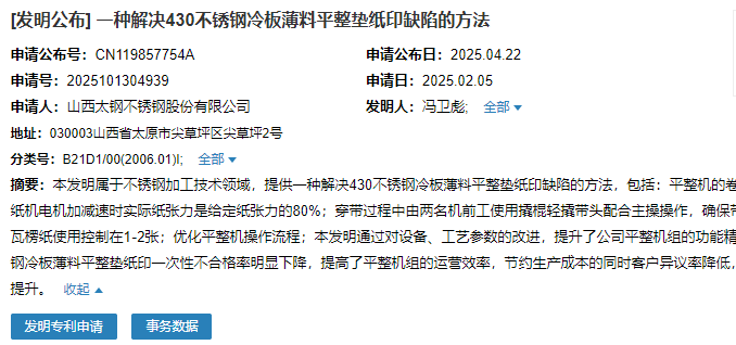 2025年4月22日,山西太鋼不銹鋼股份有限公司成功申請(qǐng)一項(xiàng)名為“一種解決430不銹鋼冷板薄料平整墊紙印缺陷的方法”專利,申請(qǐng)公布號(hào)為CN119857754A,申請(qǐng)日期為2025年2月5日。