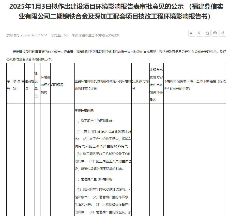 2025年1月3日,寧德市生態(tài)環(huán)境局就福建鼎信實業(yè)有限公司二期鎳鐵合金及深加工配套項目技改工程環(huán)境影響報告書作出審批意見并對外進(jìn)行公示,公示時間:2025年1月3日-2025年1月9日(5個工作日)。