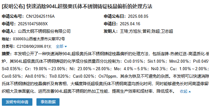 2025年8月5日,山西太鋼不銹鋼股份有限公司成功申請(qǐng)一項(xiàng)名為“速消除904L超級(jí)奧氏體不銹鋼鑄錠枝晶偏析的處理方法”專利,申請(qǐng)公布號(hào)為CN120425116,申請(qǐng)日期為2025年4月16日。